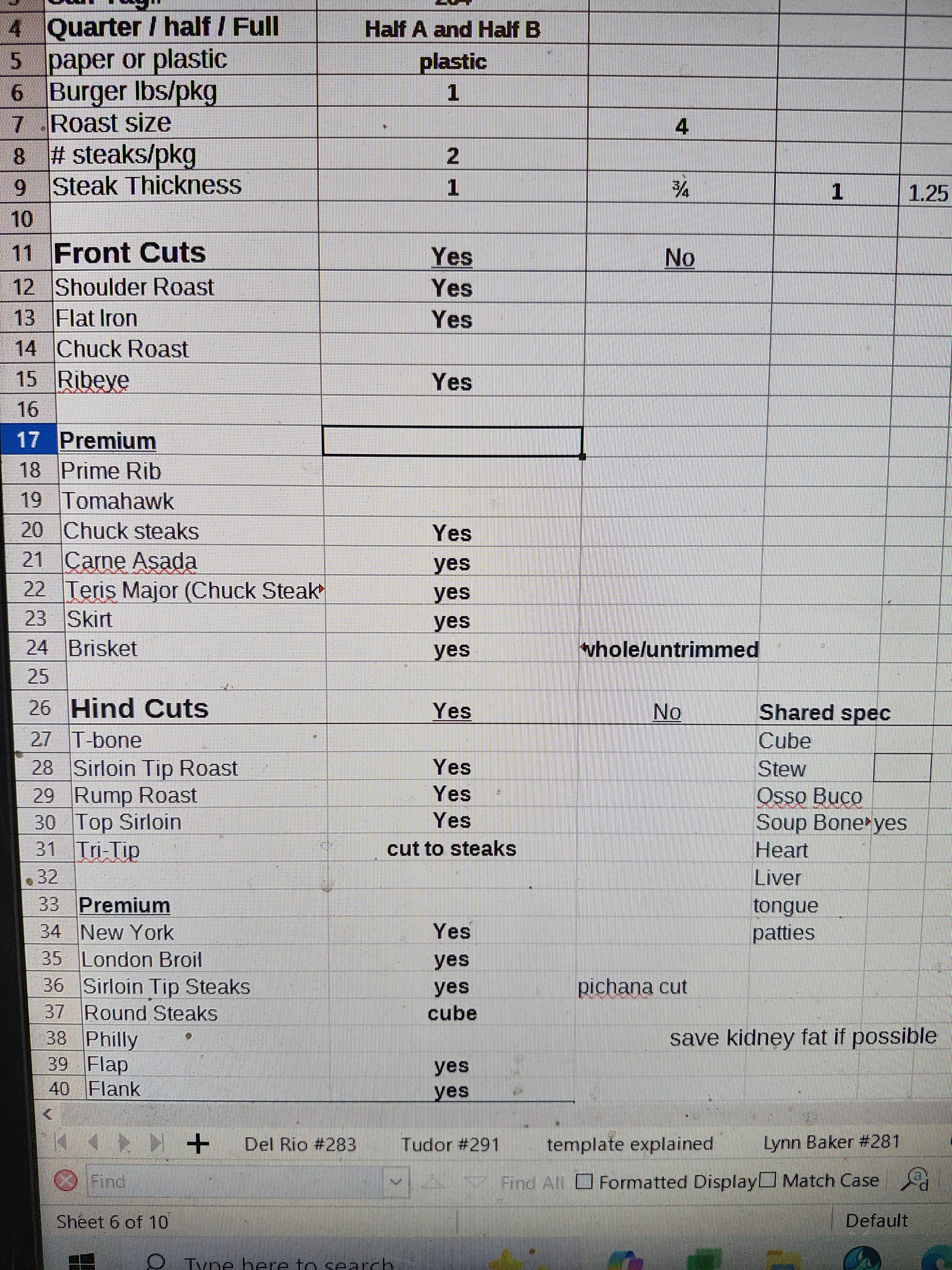 FILL OUT CUT SHEETShould you decide on custom cuts because you want a tomahawk steak, a full picahna, or whole tenderloin, Alan will guide you through these and other options which will be made to your specification--but NOTE it will probably take a month from when you order. You might start thinking about paper or plastic wrap?
